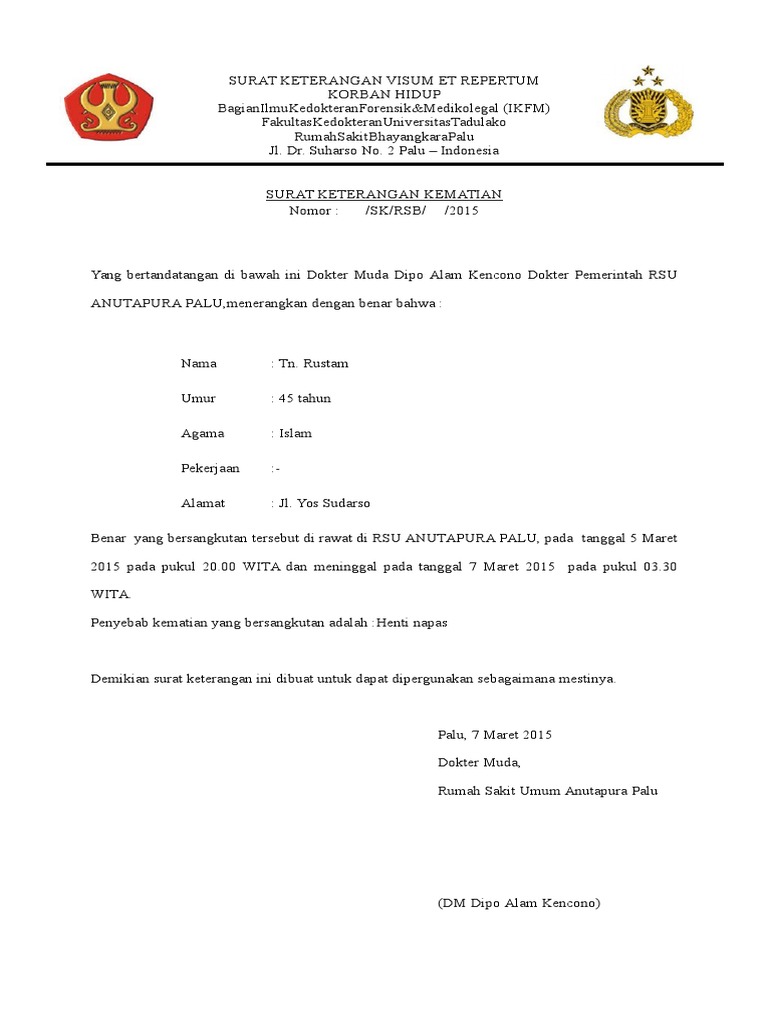 Dalam hal ini kita akan tetap membahas mengenai contoh surat yaitu yang berhubungan dengan hak milik. Surat keterangan cuti hamil surat keterangan untuk menikah surat keterangan klaim asuransi surat. Untuk membuat rekening bank dibutuhkan data informasi pribadi yang dibuktikan dengan identitas. Format surat keterangan kematian pada umumnya berisi nama, tempat tanggal lahir, umur. Surat keterangan kematian adalah sebuah surat yang dikeluarkan oleh kelurahan atau desa untuk menerangkan bahwa seseorang telah meninggal dunia. Contoh surat keterangan usaha untuk pengajuan kredit. Demikian surat keterangan ini dibuat untuk digunakan seperlunya. 100% based on 99998 ratings. Contoh surat keterangan akta kelahiran. Contoh surat keterangan kematian rumah sakit. Dengan mencari langsung contohnya di google mungkin kita bisa mendapatkan format surat keterangan kematian yang kita butuhkan jika kita menggunakan kode di atas. Biasanya di gunakan sebagai pengganti tanda tangan judul: Penulisan penyebab kematian berdasarkan icd 10 dan kepentingan hukum.